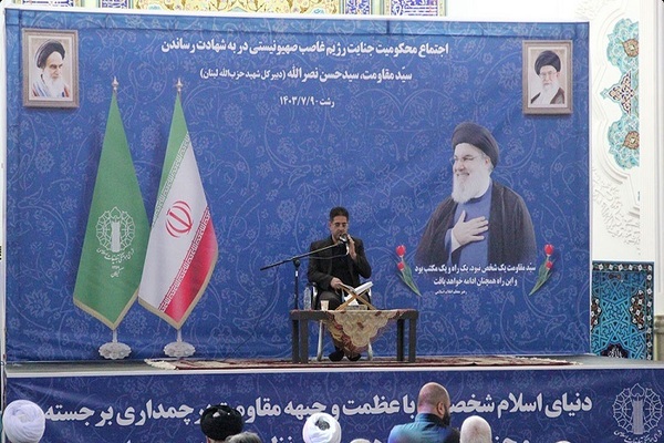 اجتماع مردم رشت علیه جنایات وحشیانه رژیم کودککش صهیونیستی و آمریکای جنایتکار در پی شهادت سید حسن نصرالله امروز، 9 مهر ماه با حضور اسدالله عباسی، استاندار گیلان و جمعی از مسئولان با سخنرانی آیتالله رسول فلاحتی، نماینده ولی فقیه در استان و امام جمعه رشت در مصلی بزرگ حضرت امام خمینی(ره) این شهر برگزار شد.